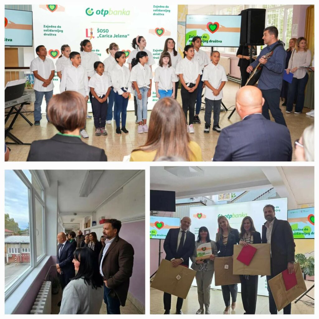 Под слоганом „Заједно до солидарнијег друштва“, реализовани пројекат представљен је медијима, уз пригодну приредбу у којој су учествовали наши ученици. У име ученика и запослених, директорка школе Наташа Каличанин упутила је искрену захвалност ОТП банци и уручила захвалнице као знак признања за пружену подршку. Присутнима се обратио и председник Извршног одбора ОТП банке Србија, господин Предраг Михајловић, нагласивши значај друштвене одговорности и улагања у образовање. Наши донатори су овом приликом обрадовали све ученике поклонивши им школске ранчеве и флашице за воду, док су представници медија, гости и запослени у школи добили цегере, шоље и роковнике.